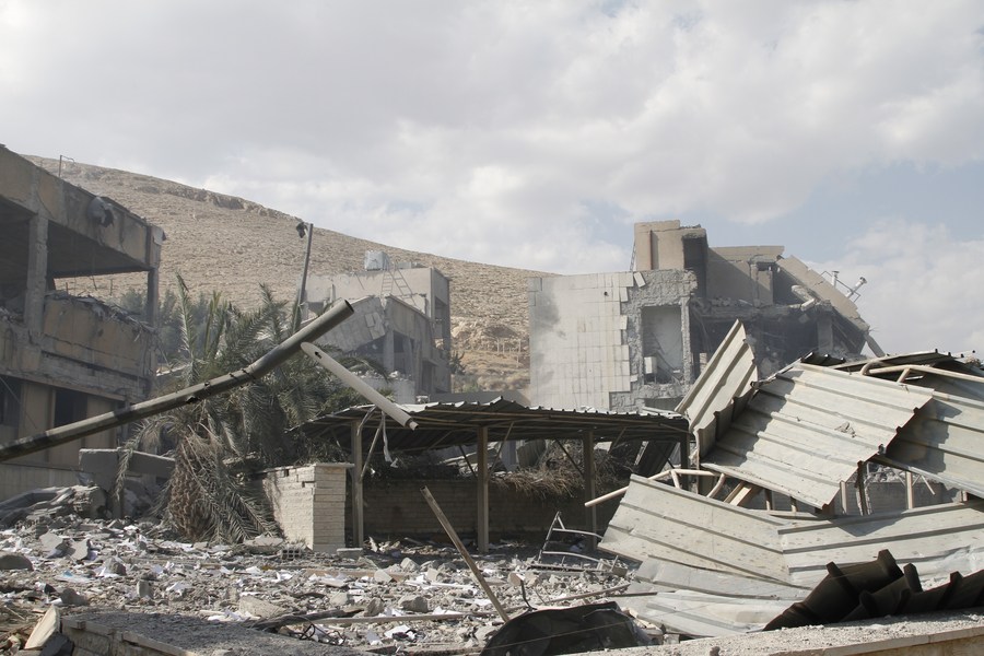 Photo taken on April 14, 2018 shows relics of the Scientific Research Center in the Barzeh neigborhood of northeast of Damascus, after United States, Britain and France carried out a wave of joint airstrikes on Syrian military facilities. (Xinhua/Monsef Memari)