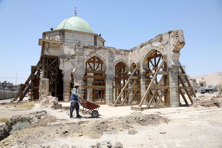 Photo taken on July 3, 2022 shows the reconstruction site of the Grand al-Nuri Mosque in the old city of Mosul, Iraq. (Xinhua/Khalil Dawood)