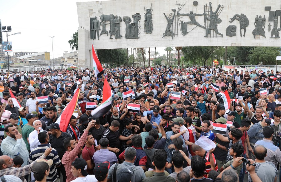 Iraqis protest against U.S.-led attacks on Syria, at Tahrir Square, Baghdad, Iraq, on April 15, 2018. (Xinhua/Khalil Dawood)