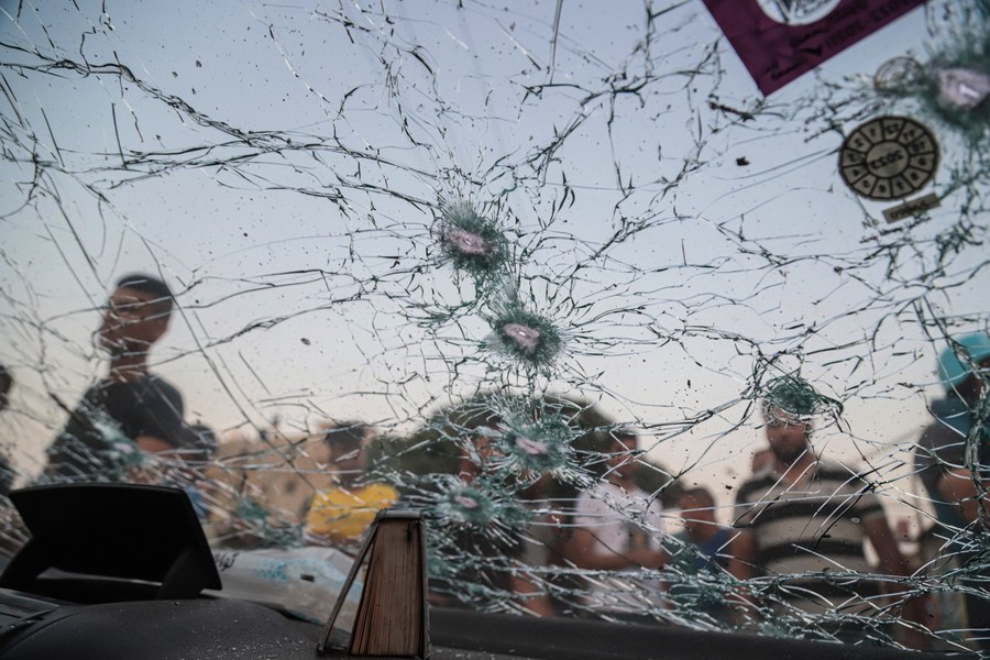 Palestinian people inspect a damaged vehicle after an Israeli airstrike in Gaza City, on Aug. 7, 2022. (Photo by Rizek Abdeljawad/Xinhua)