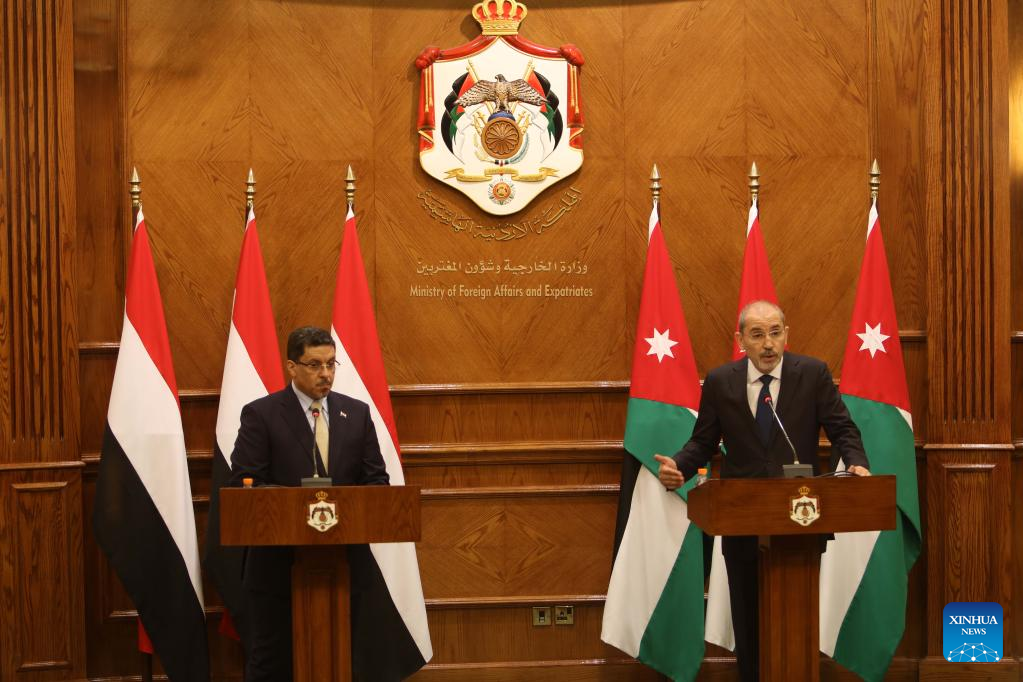 Jordanian Foreign Minister Ayman Safadi (R) and visiting Yemeni Foreign Minister Ahmed Awad Bin Mubarak attend a joint press conference in Amman, Jordan, on Aug. 8, 2022. Jordan and Yemen on Monday signed a memorandum of understanding (MoU) to strengthen bilateral relations and set a political consultation mechanism between the two foreign ministries. (Photo by Mohammad Abu Ghosh/Xinhua)
