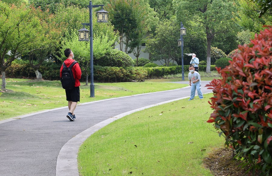 People take a walk at a park in Minhang District of east China's Shanghai, May 27, 2022. (Xinhua/Fang Zhe)