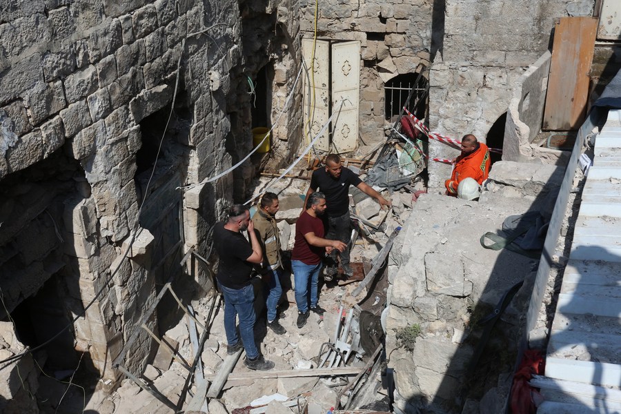 Palestinians inspect a damaged house hit by Israeli shells in the West Bank city of Nablus, on Aug. 9, 2022. (Photo by Nidal Eshtayeh/Xinhua) ■