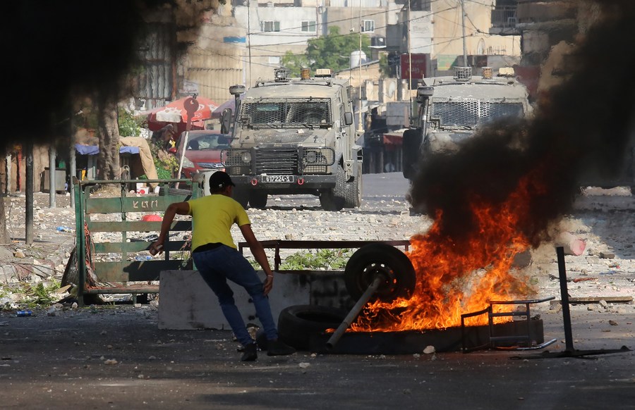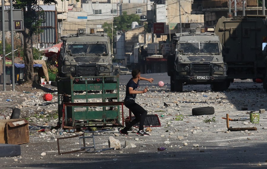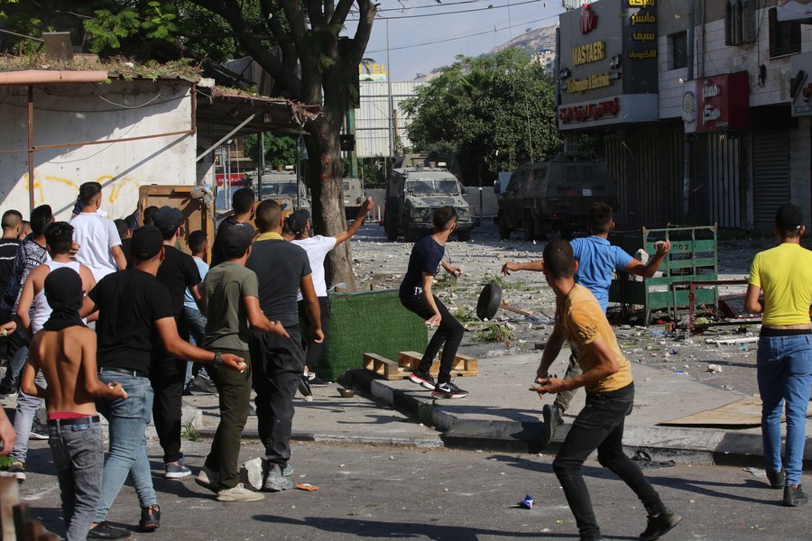 Palestinian protesters hurl stones at Israeli military vehicles during clashes in the West Bank city of Nablus, on Aug. 9, 2022. (Photo by Nidal Eshtayeh/Xinhua)