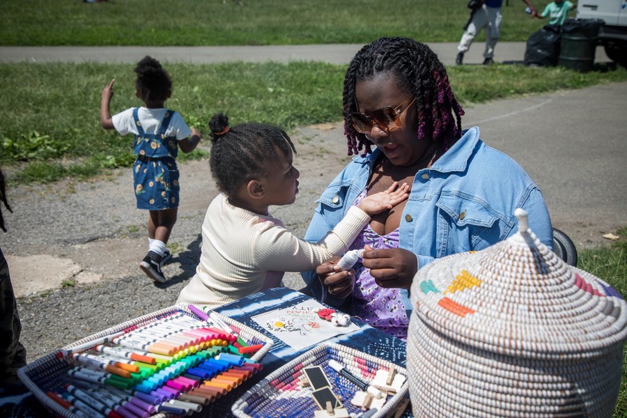 Indira Findlay (R) designs a patch memorializing her children's grandfather who was a victim of the COVID-19 pandemic, for the quilt project during the 13th Annual Juneteenth Festival in Prospect Park in the Brooklyn borough of New York, the United States, on June 19, 2022. (Photo by Michael Nagle/Xinhua)