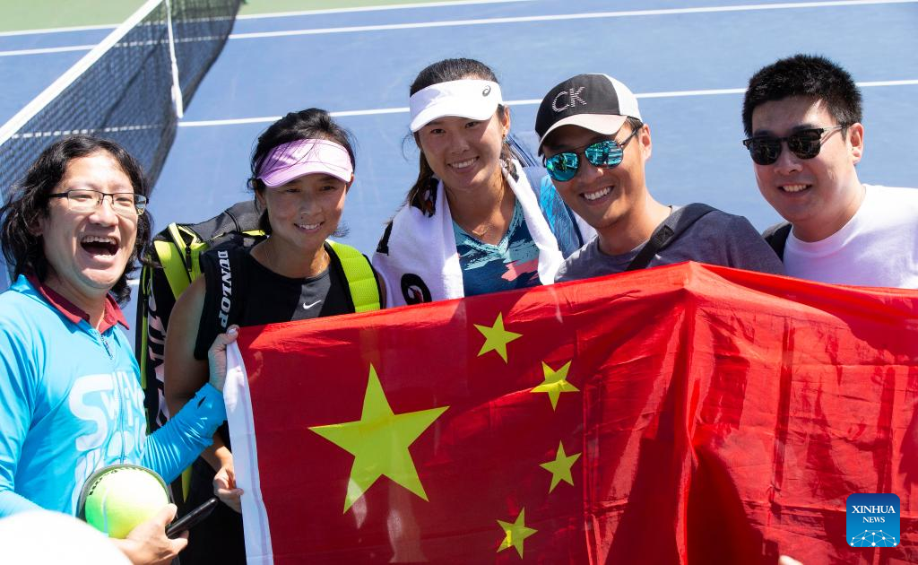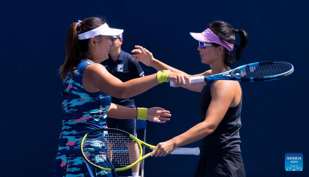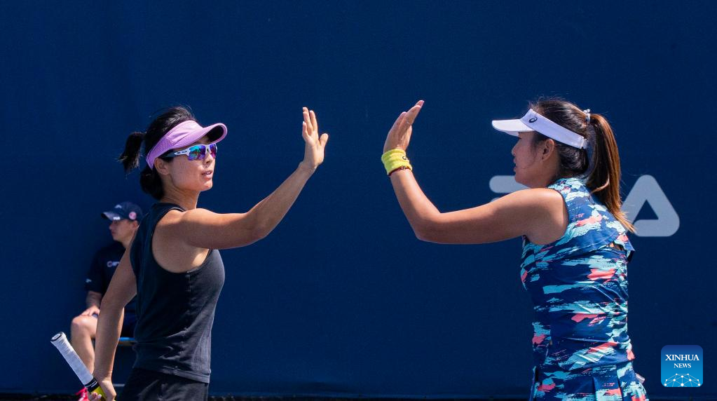 Xu Yifan (R)/Yang Zhaoxuan of China celebrate victory after the first round of women's doubles match between Xu Yifan/Yang Zhaoxuan of China and Aoyama Shuko of Japan and Chan Hao-ching of Chinese Taipei at the 2022 National Bank Open tennis tournament in Toronto, Canada, on Aug. 10, 2022. (Photo by Zou Zheng/Xinhua)