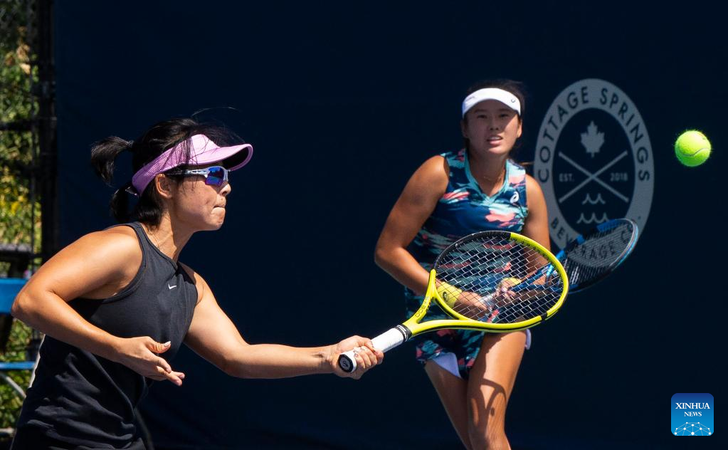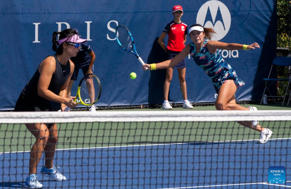 Xu Yifan (L)/Yang Zhaoxuan of China compete during the first round of women's doubles match between Xu Yifan/Yang Zhaoxuan of China and Aoyama Shuko of Japan and Chan Hao-ching of Chinese Taipei at the 2022 National Bank Open tennis tournament in Toronto, Canada, on Aug. 10, 2022. (Photo by Zou Zheng/Xinhua)