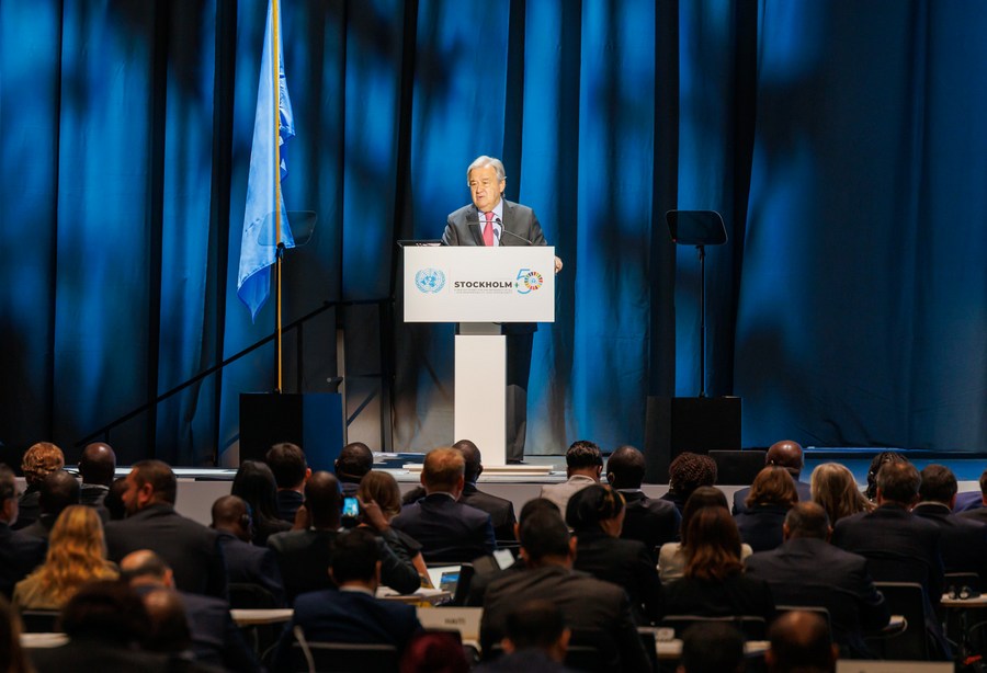 UN Secretary-General Antonio Guterres delivers a speech at the opening plenary of a UN environment meeting in Stockholm, Sweden, on June 2, 2022.(Photo by Wei Xuechao/Xinhua)