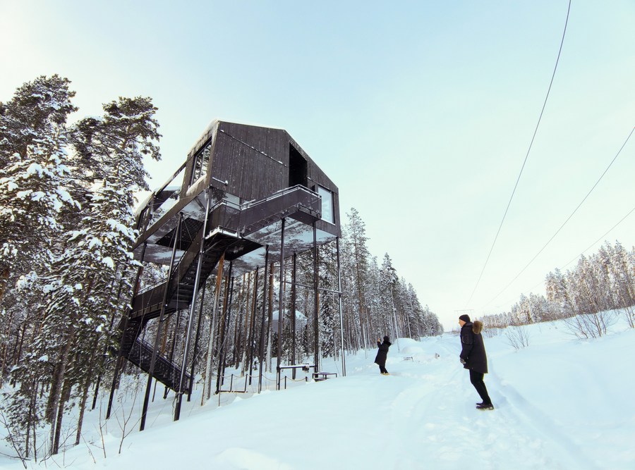 Photo taken on Feb. 2, 2021 shows a room of a tree hotel, located about 150 kilometers south of the Arctic Circle, northern Sweden. (Photo by Wei Xuechao/Xinhua)
