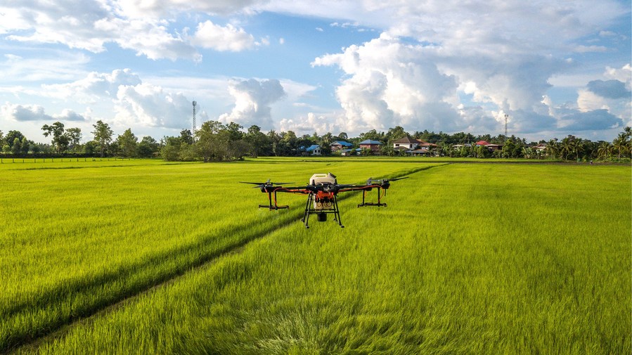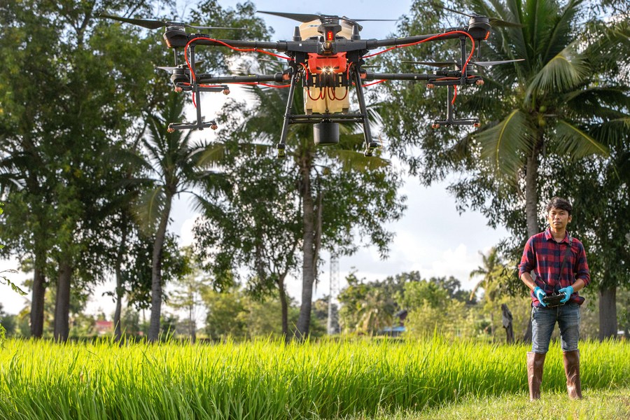 A Thai farmer operates a DJI agricultural drone in Roi Et, Thailand, on Aug. 1, 2022. (Xinhua/Wang Teng)
