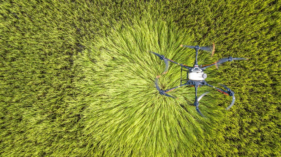 Aerial photo taken on Aug. 1, 2022 shows a DJI agricultural drone spraying pesticides in Roi Et, Thailand. (Xinhua/Wang Teng)