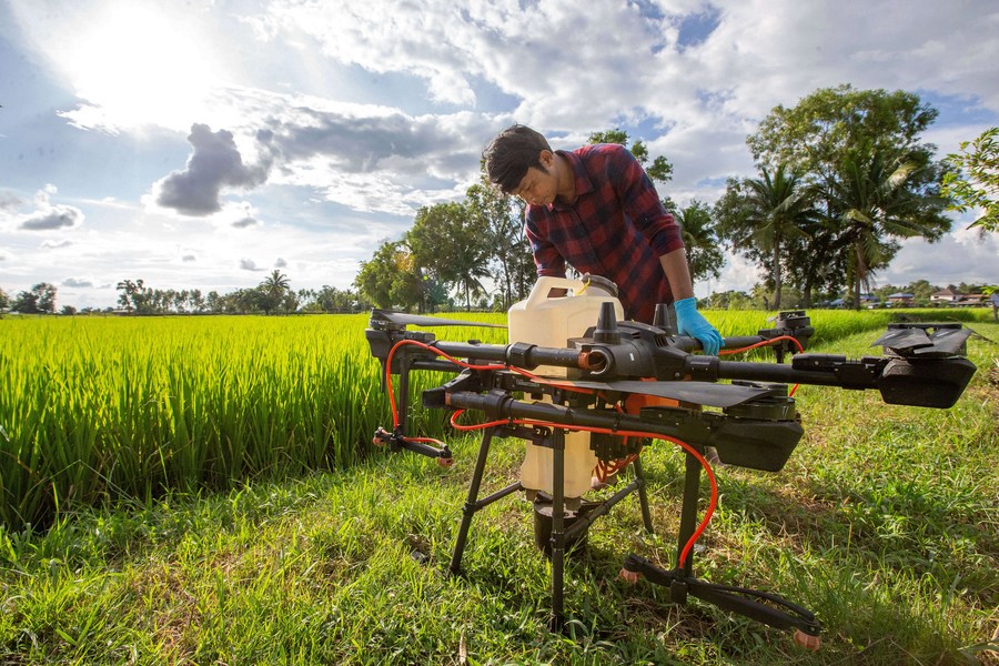A Thai farmer checks a DJI agricultural drone in Roi Et, Thailand, on Aug. 1, 2022. (Xinhua/Wang Teng)