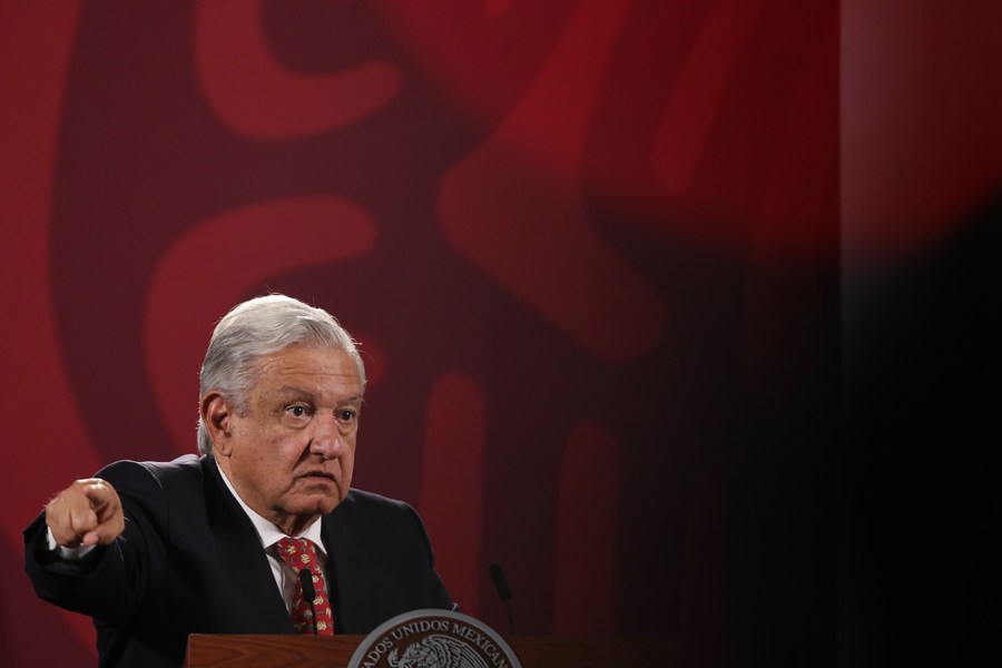 Mexican President Andres Manuel Lopez Obrador reacts during his morning press conference at the National Palace in Mexico City, capital of Mexico, June 6, 2022. (Photo by Francisco Canedo/Xinhua)