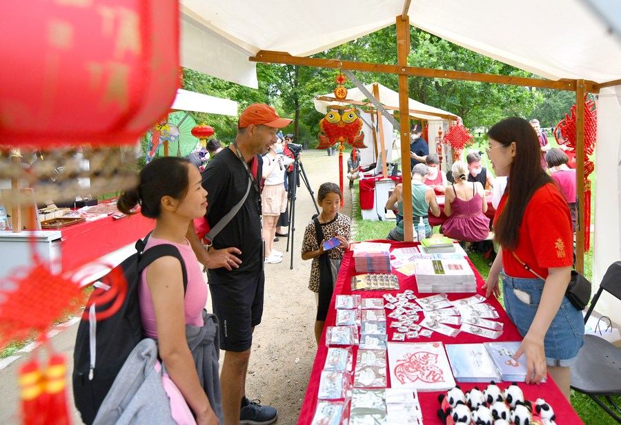 People visit a Chinese exhibition booth during the cultural festival "Culture meets Garden" at the Gardens of the World in Berlin, Germany, on Aug. 13, 2022. (Xinhua/Ren Pengfei)
