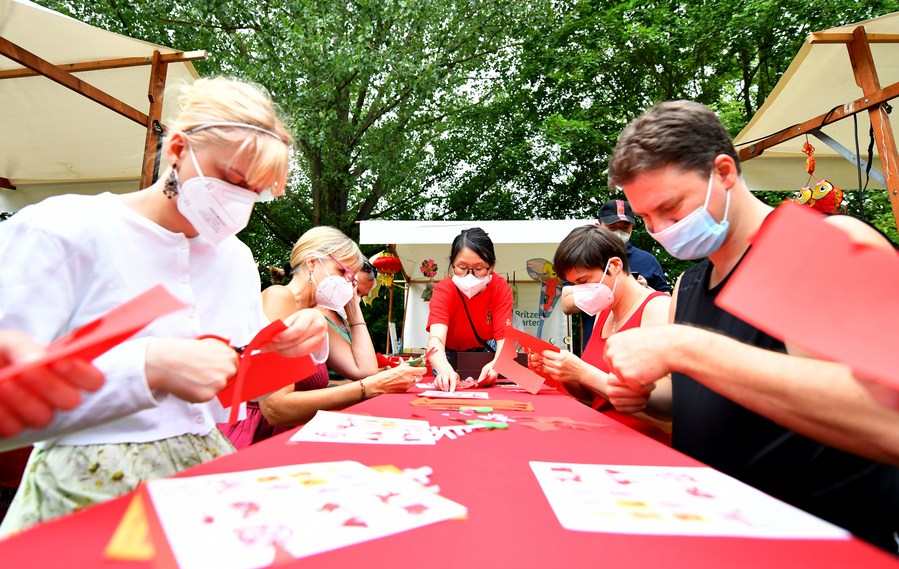 People learn paper-cutting during the cultural festival "Culture meets Garden" at the Gardens of the World in Berlin, Germany, on Aug. 13, 2022. (Xinhua/Ren Pengfei)
