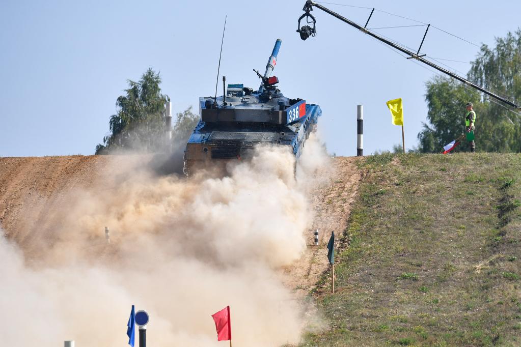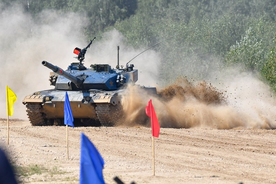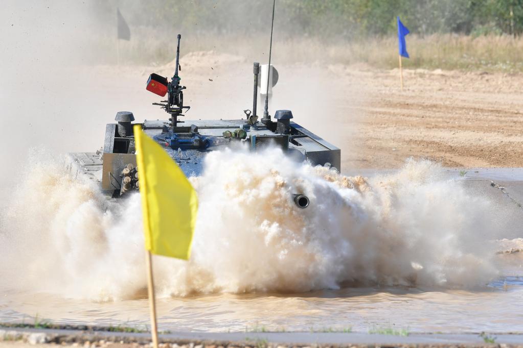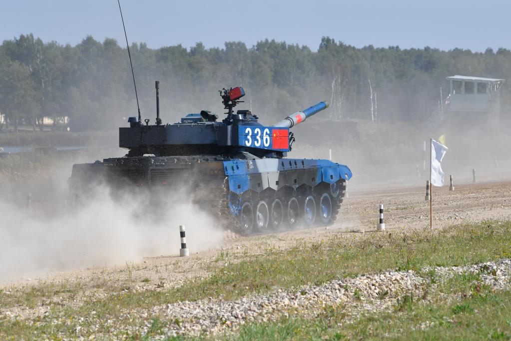 The Chinese team takes part in the tank biathlon of the International Army Games 2022 at the Alabino training ground in the Moscow region, Russia, Aug. 14, 2022. (Photo by Alexander Zemlianichenko Jr/Xinhua)