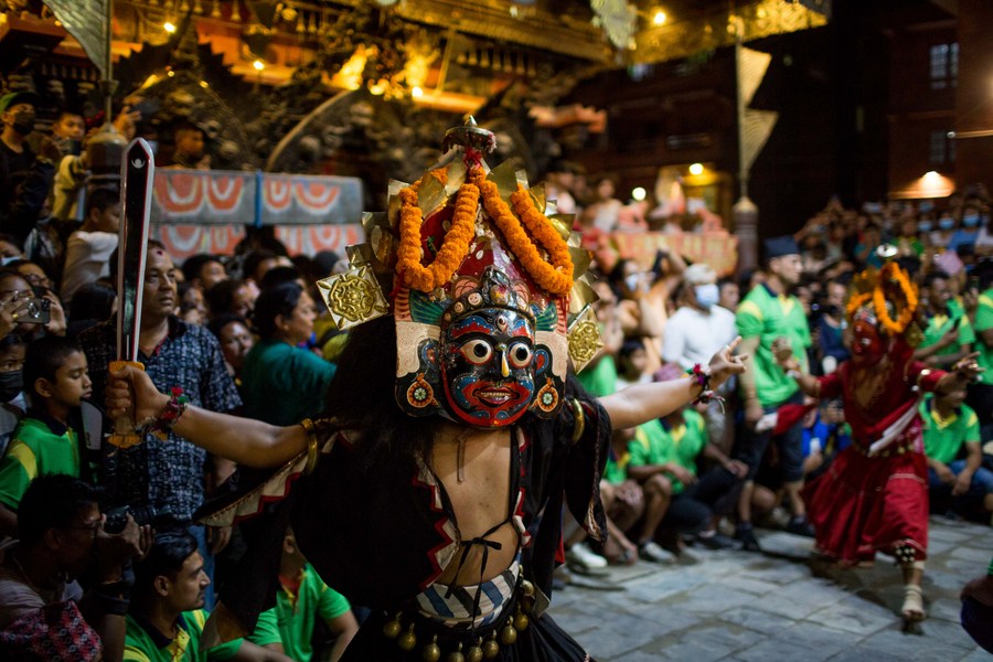 Masked dancers perform during the Nil Barahi dance festival in Bhaktapur, Nepal, Aug. 14, 2022. (Photo by Sulav Shrestha/Xinhua)