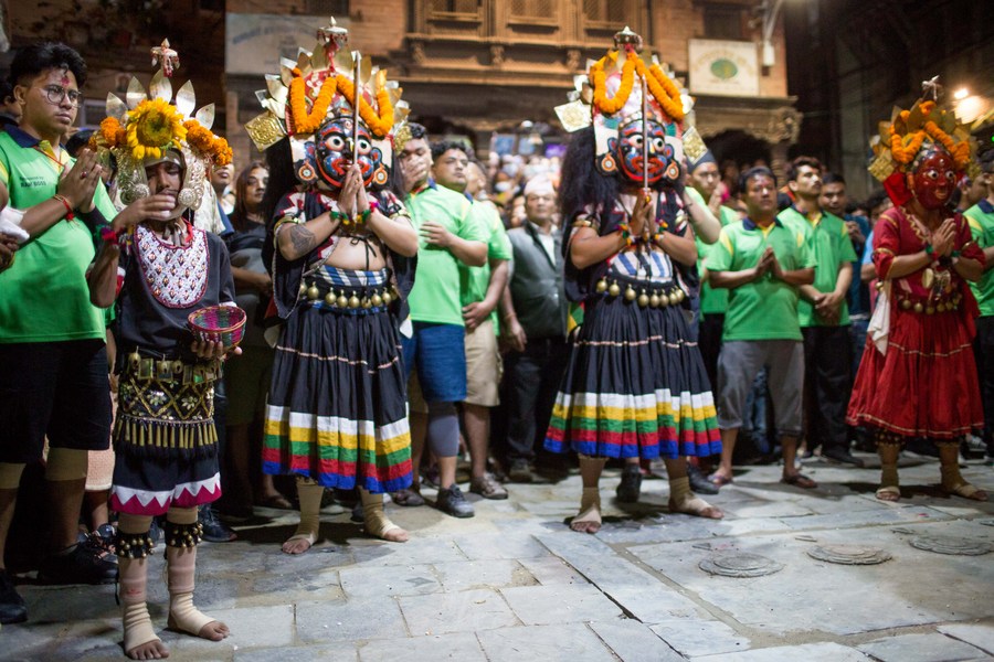 BHAKTAPUR, Nepal, Aug. 16 (Xinhua) -- Nil Barahi, a four-day festival in Nepal, is an annual event during which dancers perform while posing as various deities that people worship to seek blessings. People dance and cheer together to mark the Nil Barahi dance festival in Nepal's Bhaktapur.