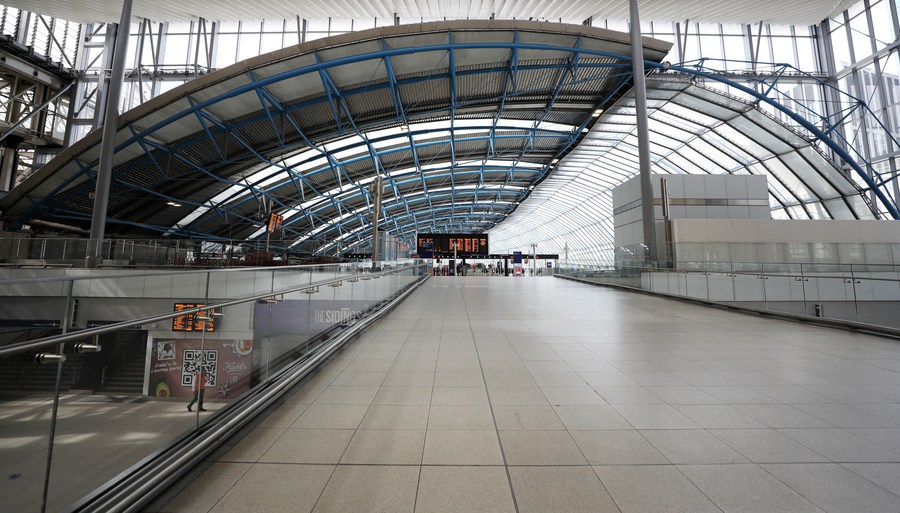 Photo taken on July 30, 2022 shows the empty Waterloo Station in London. Around 5,000 train drivers in Britain went on strike that day as part of a campaign for higher pay after the country's inflation rate hit its highest in 40 years. (Xinhua/Li Ying)