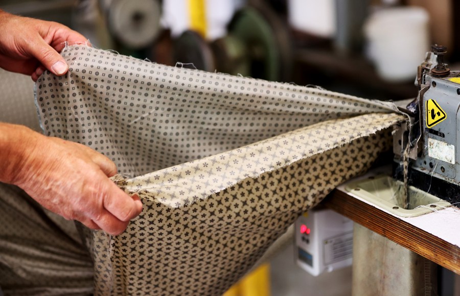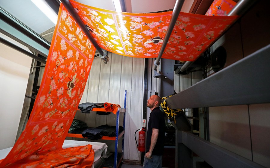 A man works in Adamley Textiles, a silk factory, in Macclesfield, Britain, Aug. 11, 2022. (Xinhua/Li Ying)