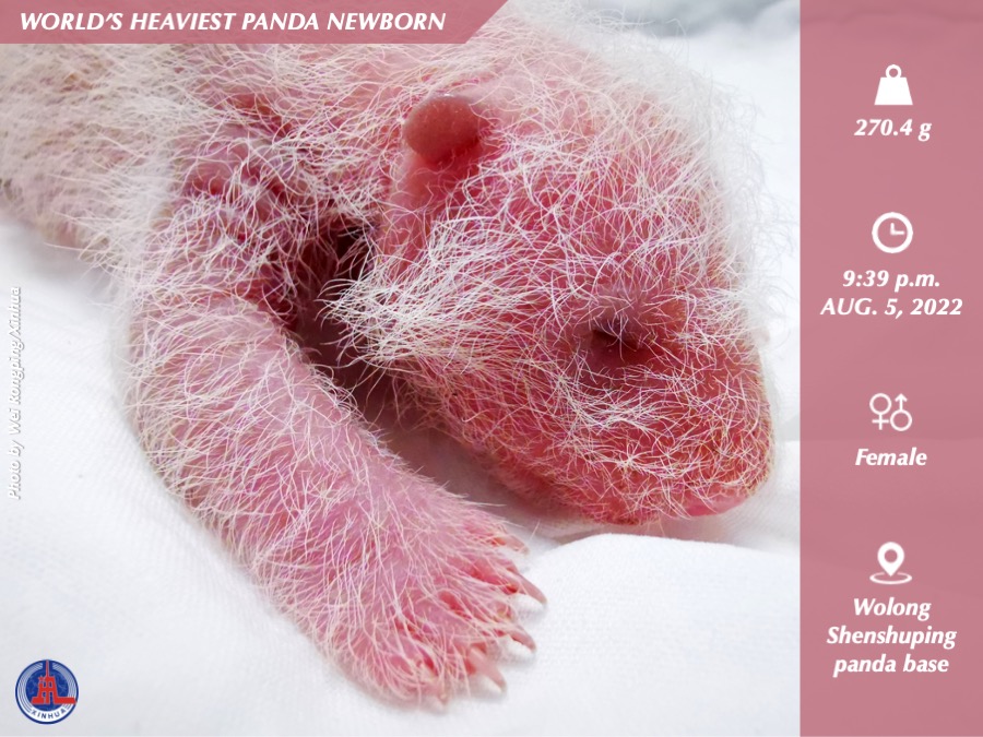 CHENGDU, Aug. 18 (Xinhua) -- A female giant panda cub weighing 270.4 grams became the world's heaviest captive panda newborn ever registered, a panda research center in southwest China's Sichuan Province said on Wednesday.
