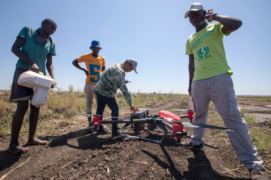 A Chinese agrotechnical expert (2nd R) teaches local workers to spray herbicides with a drone at the Wanbao Mozambique rice farm in Xai Xai, southern Mozambique, Nov. 28, 2019. (Xinhua/Zhang Yu)