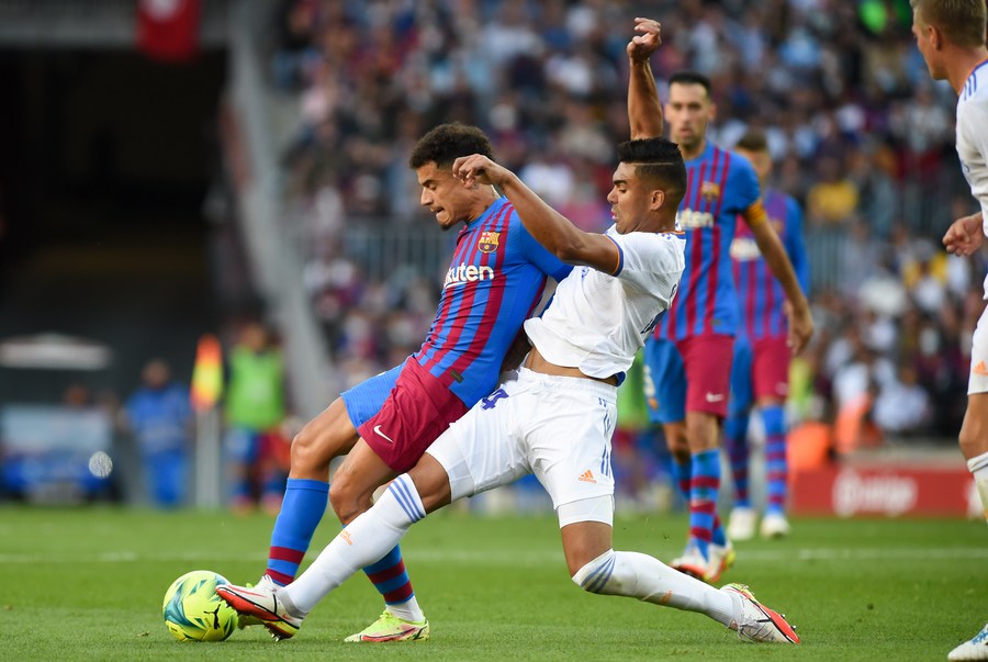 Real Madrid's Casemiro (R) vies with Barcelona's Philippe Coutinho during a Spanish La Liga football match in Barcelona, Spain, on Oct. 24, 2021. (Photo by Gustavo Valiente/Xinhua)