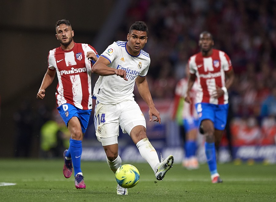 Real Madrid's Casemiro competes during a Spanish La Liga football match against Atletico de Madrid in Madrid, Spain, on May 8, 2022. (Photo by Pablo Morano/Xinhua)