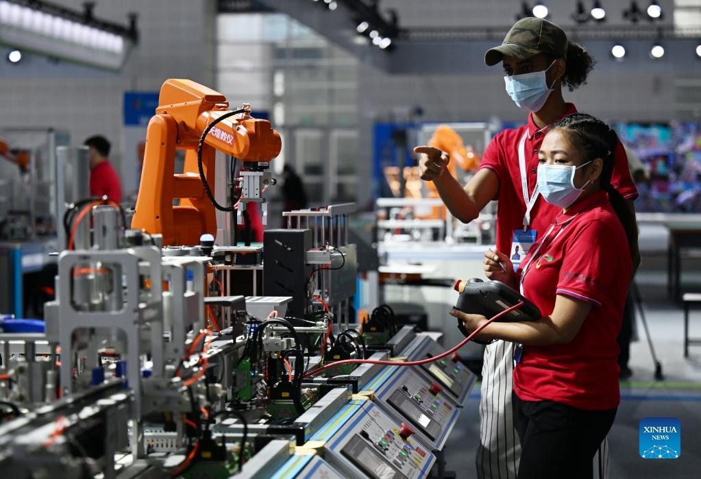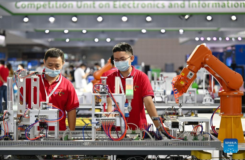 Competitors operate mechanism equipment during the World Vocational College Skills Competition in Tianjin, north China, Aug. 19, 2022. The competition, as a part of the World Vocational and Technical Education Development Conference, attracted participants from over 100 countries and regions. (Xinhua/Li Ran)