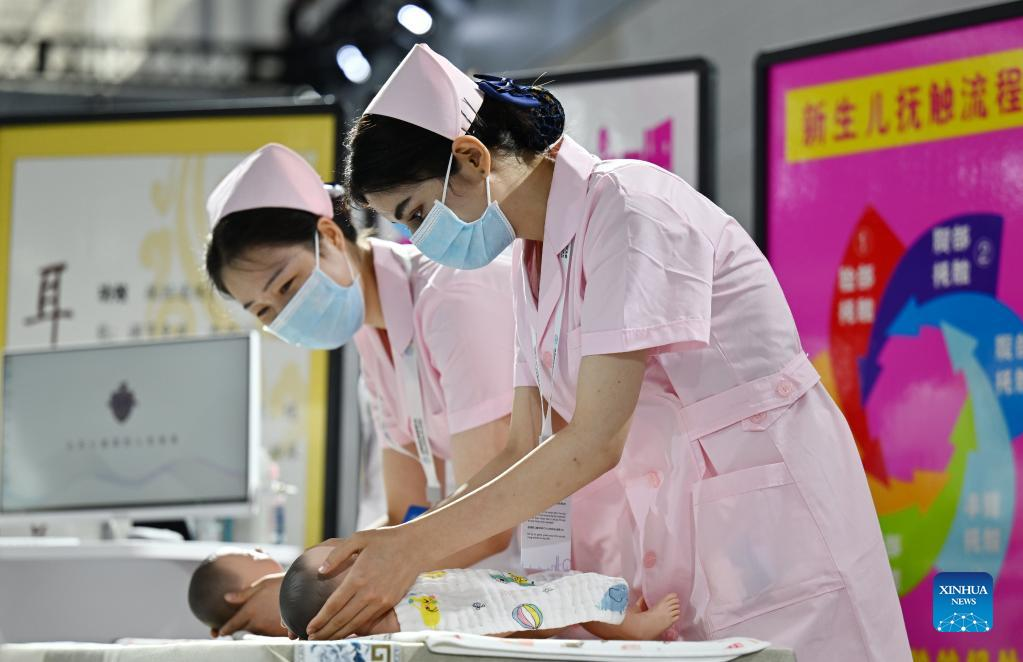 Competitors show how to give touches to newborns during the World Vocational College Skills Competition in Tianjin, north China, Aug. 19, 2022. The competition, as a part of the World Vocational and Technical Education Development Conference, attracted participants from over 100 countries and regions. (Xinhua/Li Ran)