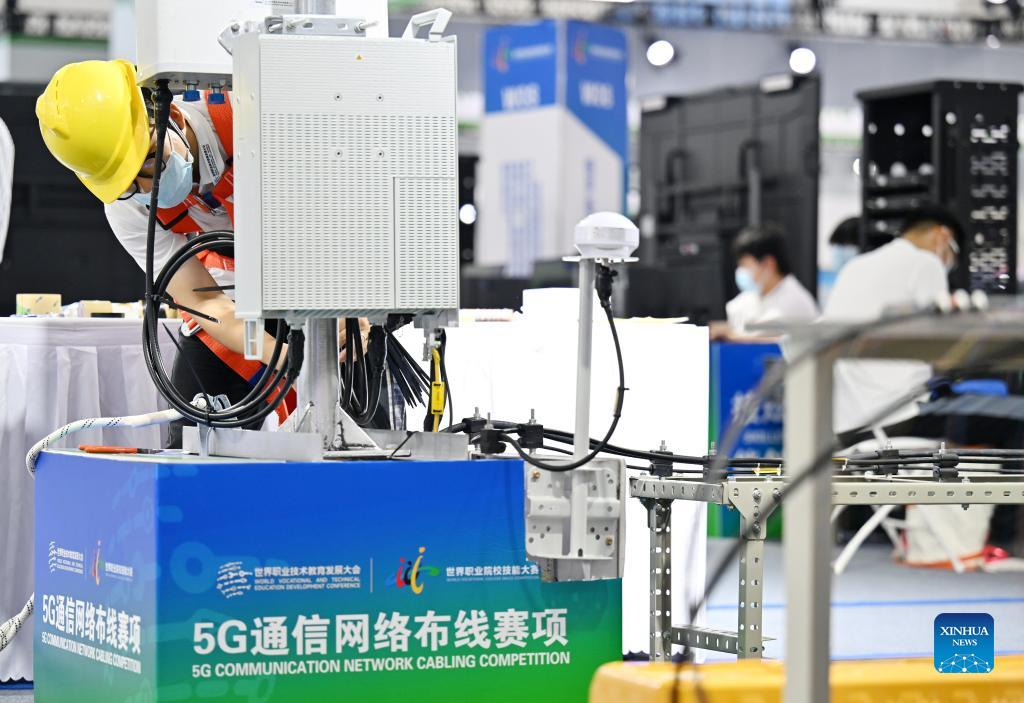 A competitor participates in a 5G communication network cabling competition during the World Vocational College Skills Competition in Tianjin, north China, Aug. 19, 2022. The competition, as a part of the World Vocational and Technical Education Development Conference, attracted participants from over 100 countries and regions. (Xinhua/Li Ran)