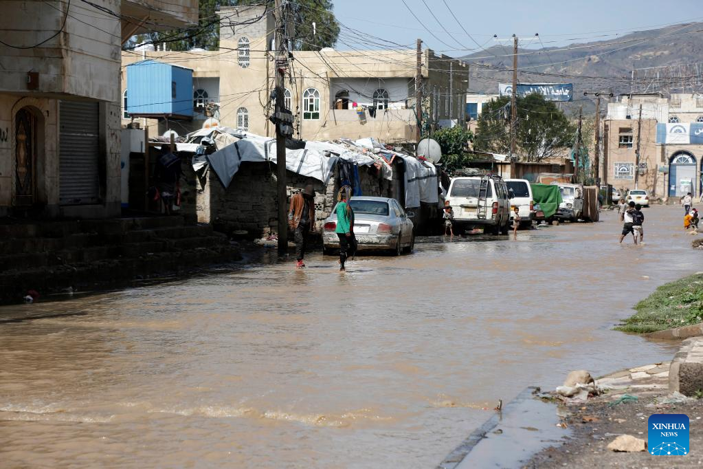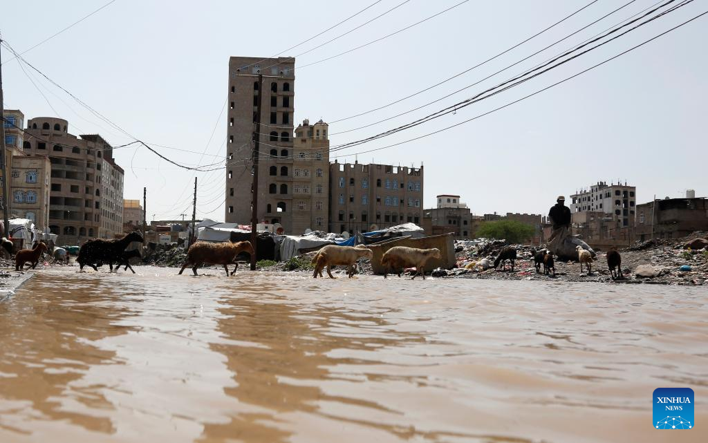 Photo taken on Aug. 19, 2022 shows a flooded street after heavy rain in Sanaa, Yemen. (Photo by Mohammed Mohammed/Xinhua)