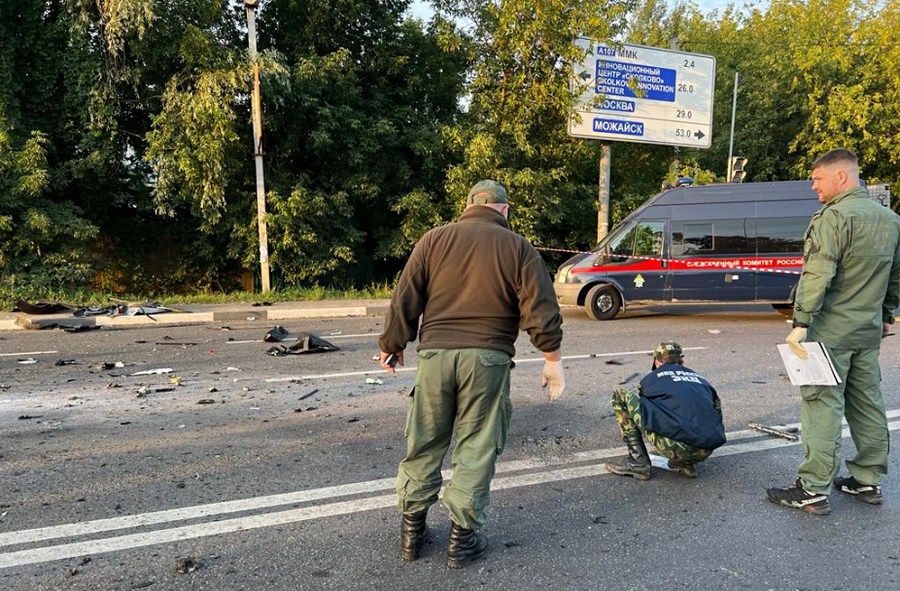 Photo released by the Russian Investigative Committee on Aug. 21, 2022 shows that investigators work at the site of the car blast.