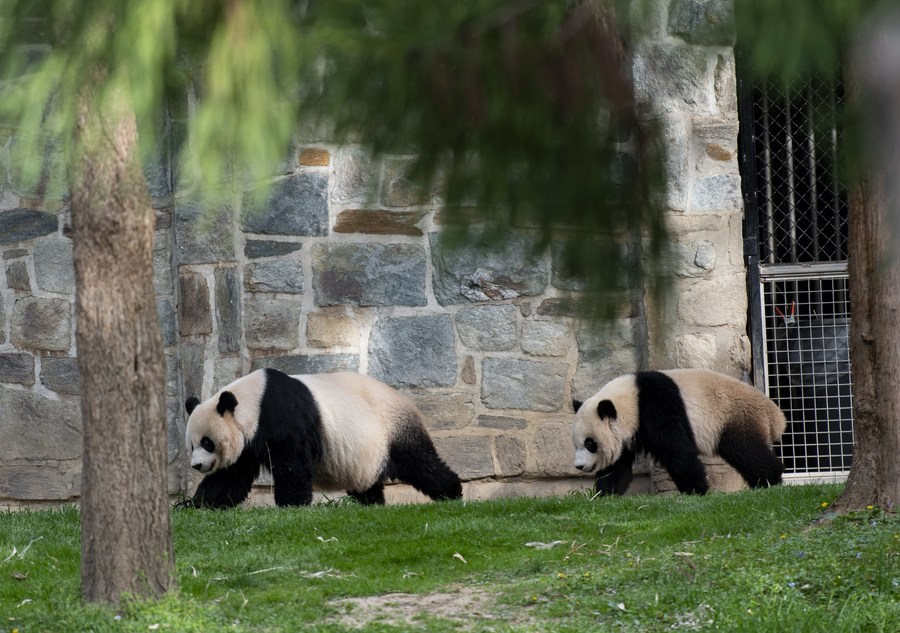 Photo taken on April 16, 2022 shows giant panda cub "Xiao Qi Ji" (R) and its mother "Mei Xiang" at Smithsonian's National Zoo in Washington, D.C., the United States. (Xinhua/Liu Jie)
