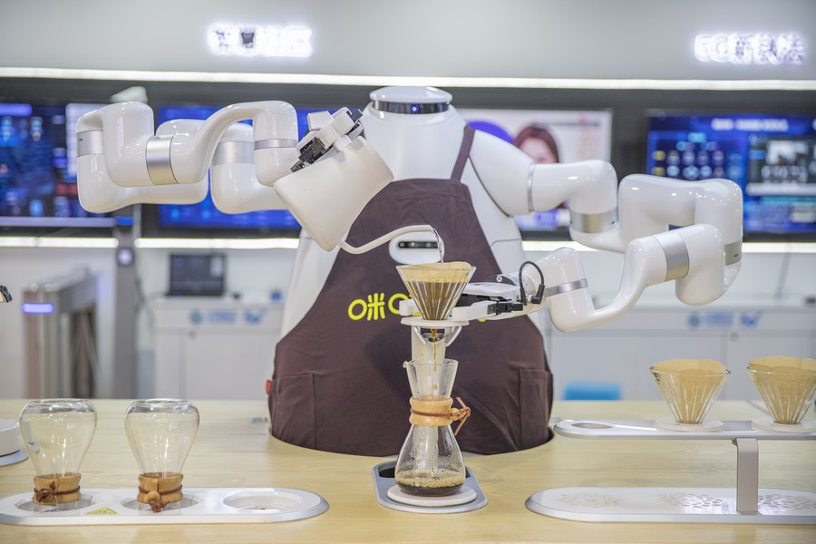 A smart robot makes coffee at the venue of the 2022 Smart China Expo in southwest China's Chongqing, Aug. 21, 2022. The 2022 Smart China Expo is set to be held from Aug. 22 to 24 both online and offline. (Xinhua/Huang Wei)