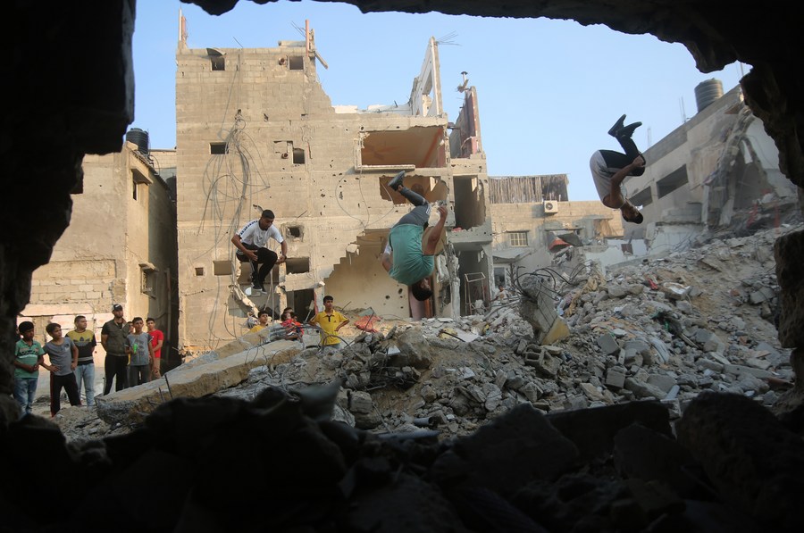 Young people practice parkour over the rubbles of the destroyed houses in the southern Gaza Strip city of Rafah, on Aug. 20, 2022. (Photo by Khaled Omar/Xinhua)■