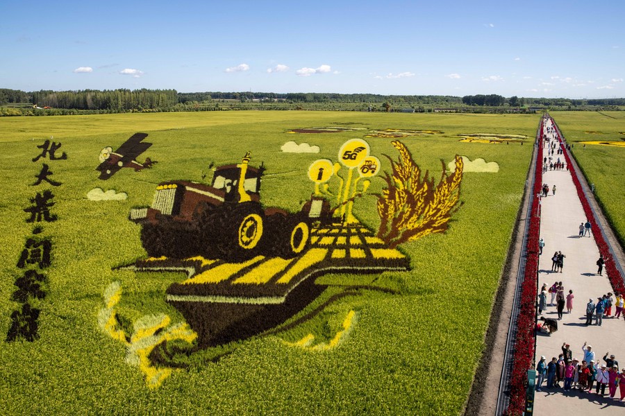 Tourists visit a modern agricultural demonstration area of Yanjiagang farm in northeast China's Heilongjiang Province, Aug. 20, 2022. (Xinhua/Zhang Tao)