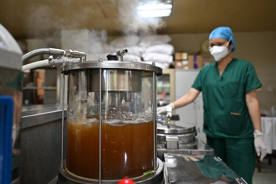 A pharmacist makes traditional Chinese medicine (TCM) decoction at the Traditional Chinese Medicine Hospital of Sanya City in Sanya, south China's Hainan province, Aug. 20, 2022. Following the latest COVID-19 resurgence, twelve makeshift hospitals and three designated hospitals in Hainan province have used TCM to fight the virus. (Xinhua/Guo Cheng)