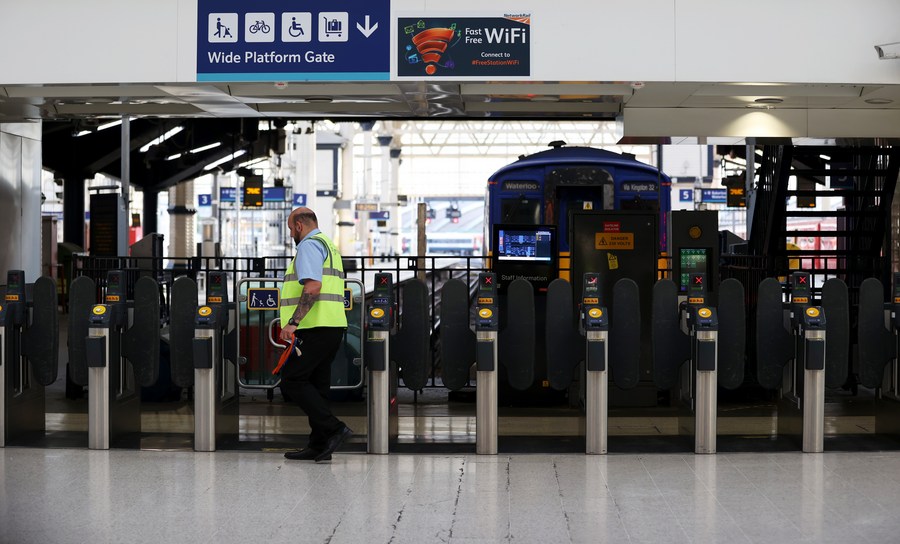 A staff member stands next to ticket gates in Waterloo Station in London, Britain, on Aug. 20, 2022. More than 50,000 workers from railway, tube and bus networks went on strike over pay and working conditions from Thursday well into the weekend. Passengers are suggested only to travel by train if necessary. (Xinhua/Li Ying)