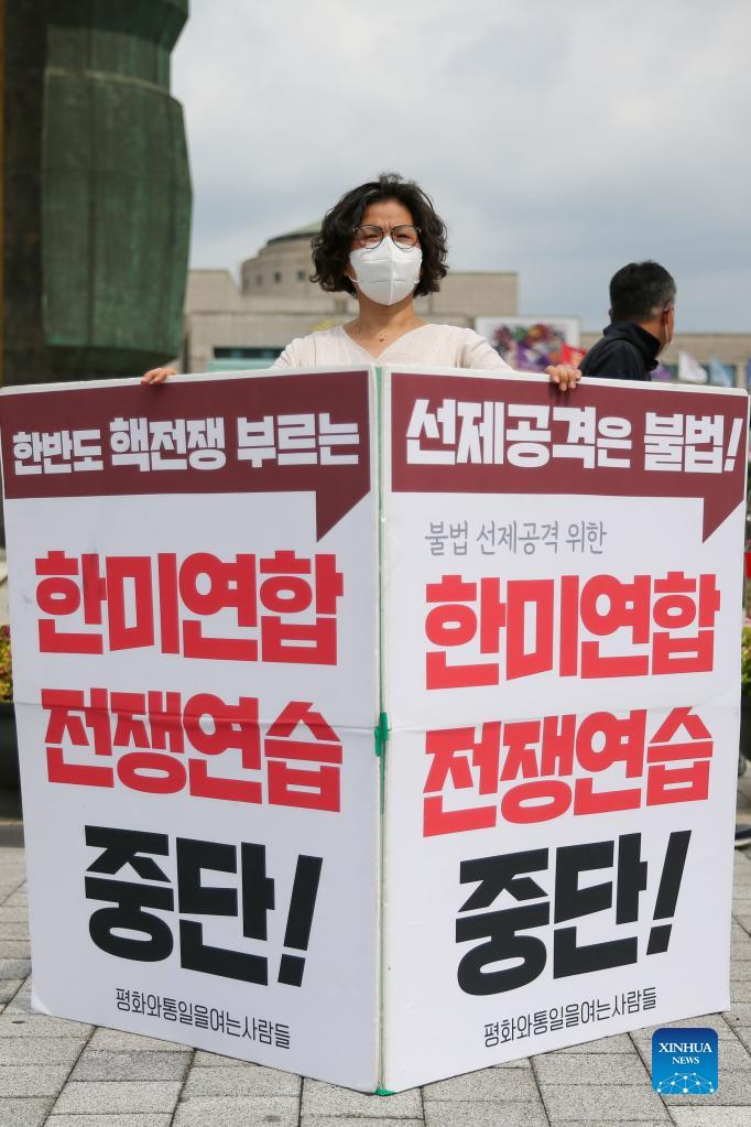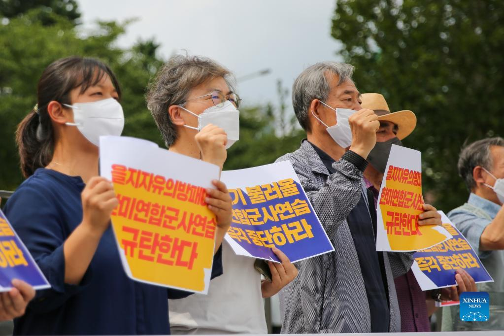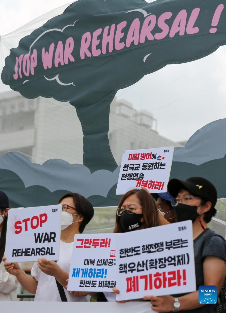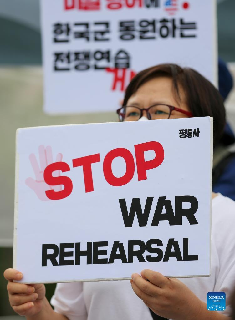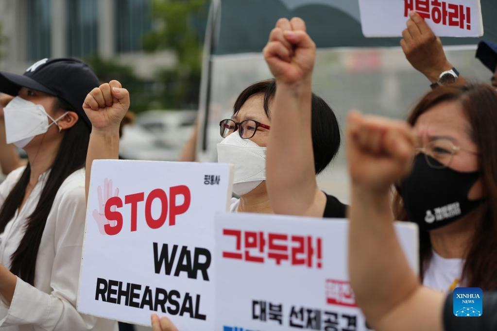 SEOUL, Aug. 22 (Xinhua) -- South Korea's peace activists on Monday cried out for a total stop of the annual South Korea-U.S. military exercise involving large-scale field maneuvers, saying the war rehearsal escalates tensions on the Korean Peninsula.