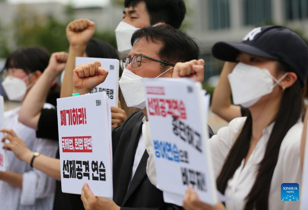 Protestors hold a rally against the South Korea-U.S. military exercise in central Seoul, South Korea, Aug. 22, 2022. South Korea's peace activists on Monday cried out for a total stop of the annual South Korea-U.S. military exercise involving large-scale field maneuvers, saying the war rehearsal escalates tensions on the Korean Peninsula. (Xinhua/Wang Yiliang)