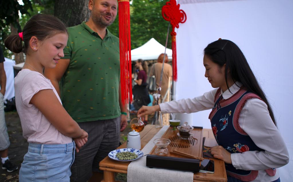 Visitors taste Chinese tea at a stand during the Cajomir Fest, an international tea festival, in Prague, the Czech Republic, on Aug. 21, 2022. (Photo by Dana Kesnerova/Xinhua)