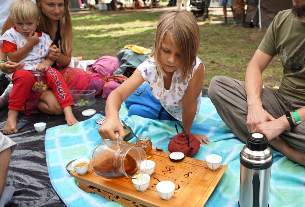 A child pours a cup of mint tea during the Cajomir Fest, an international tea festival, in Prague, the Czech Republic, on Aug. 21, 2022. (Photo by Dana Kesnerova/Xinhua)