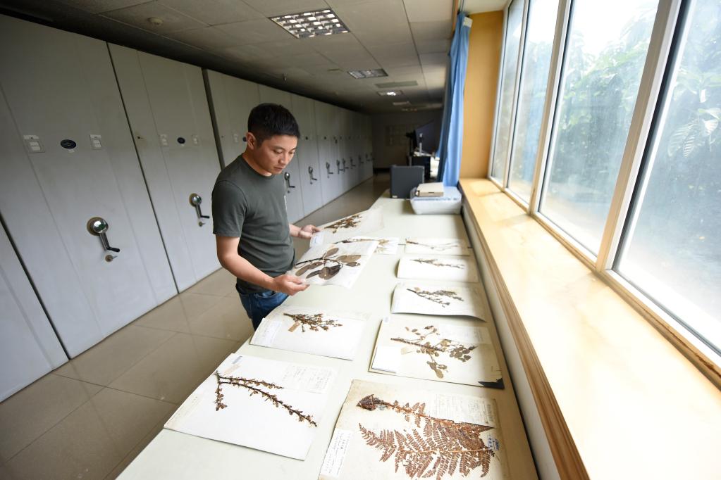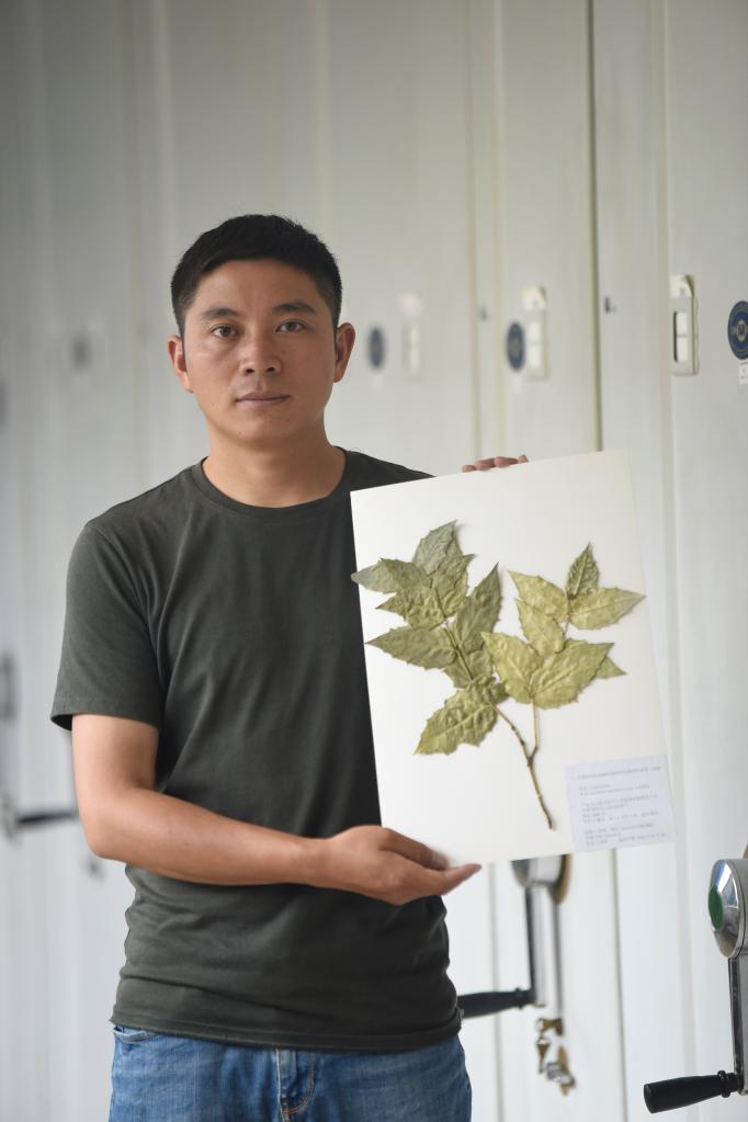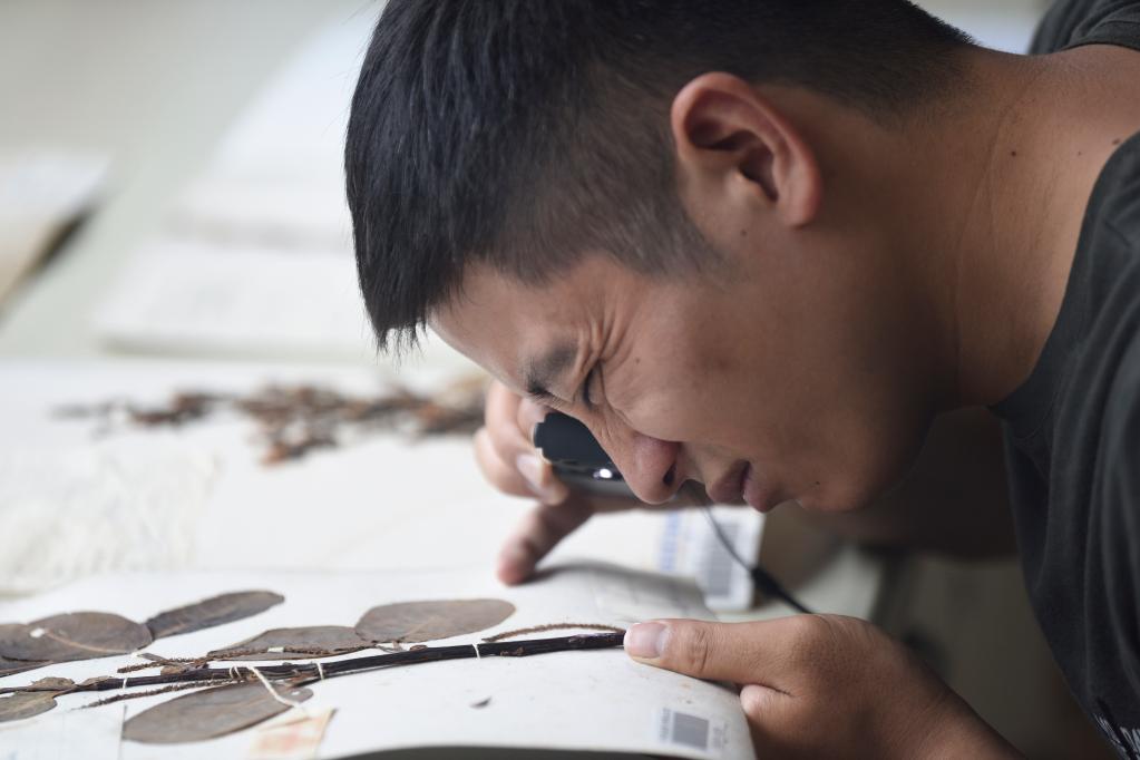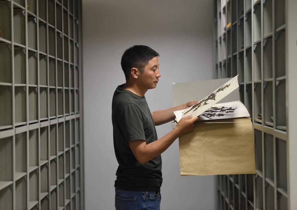 Researcher Hu Jun shows a specimen of Euonymus aquifolium at Chengdu Institute of Biology under the Chinese Academy of Sciences in southwest China's Sichuan Province, Aug. 17, 2022. (Xinhua/Liu Kun)