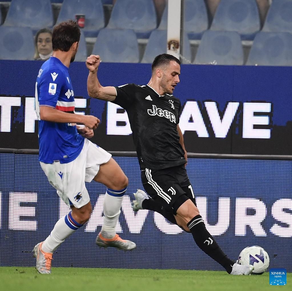 FC Juventus' Filip Kostic (R) shoots during an Italian Serie A football match between FC Juventus and Sampdoria in Genova, Italy, Aug. 22, 2022. (Photo by Federico Tardito/Xinhua)
