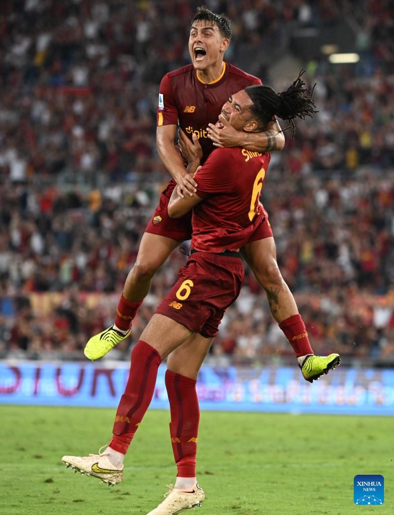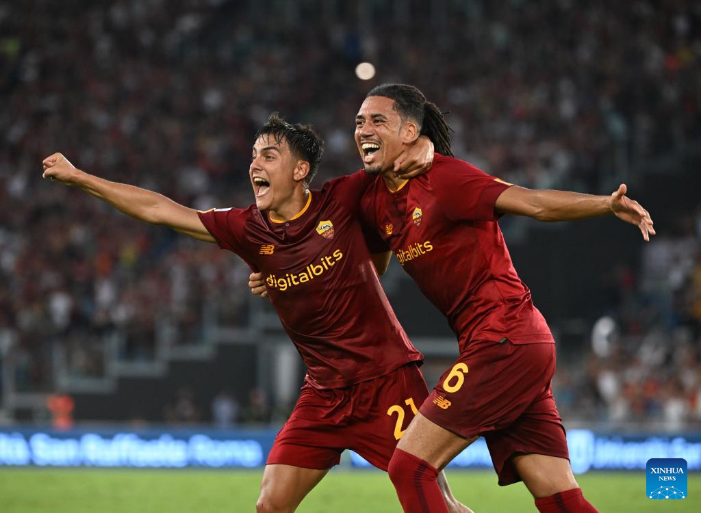 Roma's Chris Smalling (R) celebrates his goal with his teammate Paulo Dybala during a Italian Serie A football match between Roma and Cremonese in Rome, Italy, Aug. 22, 2022. (Photo by Alberto Lingria/Xinhua)