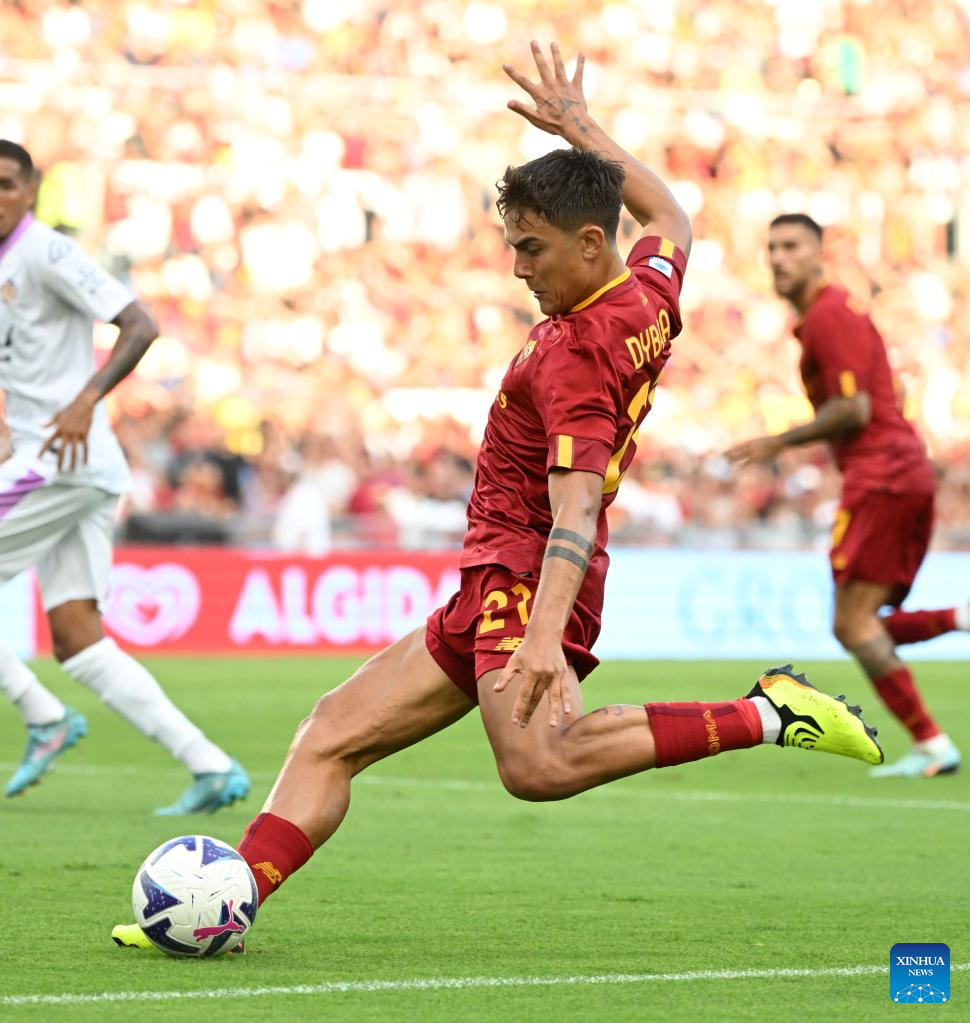 Roma's Paulo Dybala shoots during a Italian Serie A football match between Roma and Cremonese in Rome, Italy, Aug. 22, 2022. (Photo by Alberto Lingria/Xinhua)