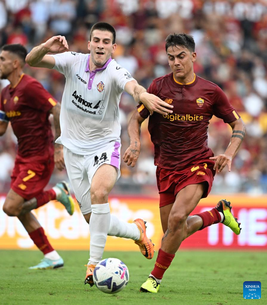 Roma's Paulo Dybala (R) vies with Cremonese's Luka Lochoshvili during a Italian Serie A football match between Roma and Cremonese in Rome, Italy, Aug. 22, 2022. (Photo by Alberto Lingria/Xinhua)