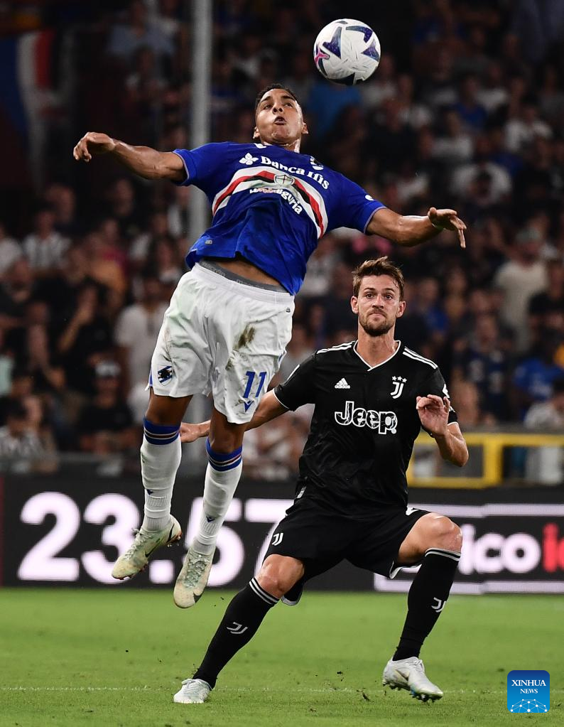FC Juventus' Daniele Rugani (R) vies with Sampdoria's Abdelhamid Sabiri during an Italian Serie A football match between FC Juventus and Sampdoria in Genova, Italy, Aug. 22, 2022. (Photo by Federico Tardito/Xinhua)