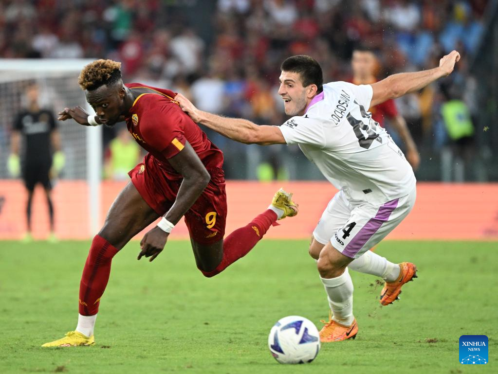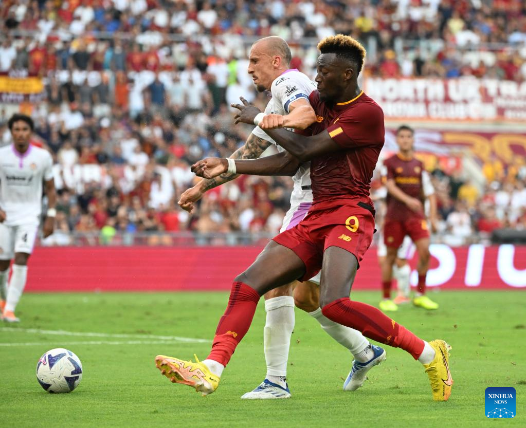 Roma's Tammy Abraham (L) vies with Cremonese's Luka Lochoshvili during a Italian Serie A football match in Rome, Italy, Aug. 22, 2022. (Photo by Alberto Lingria/Xinhua)